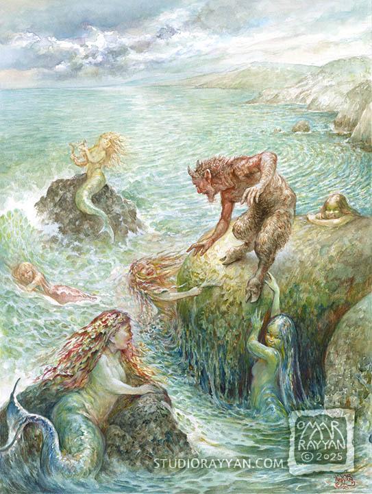 A satyr encounters a bevy of mesmerizing mermaids by the seashore. Will he be tempted by their siren call?